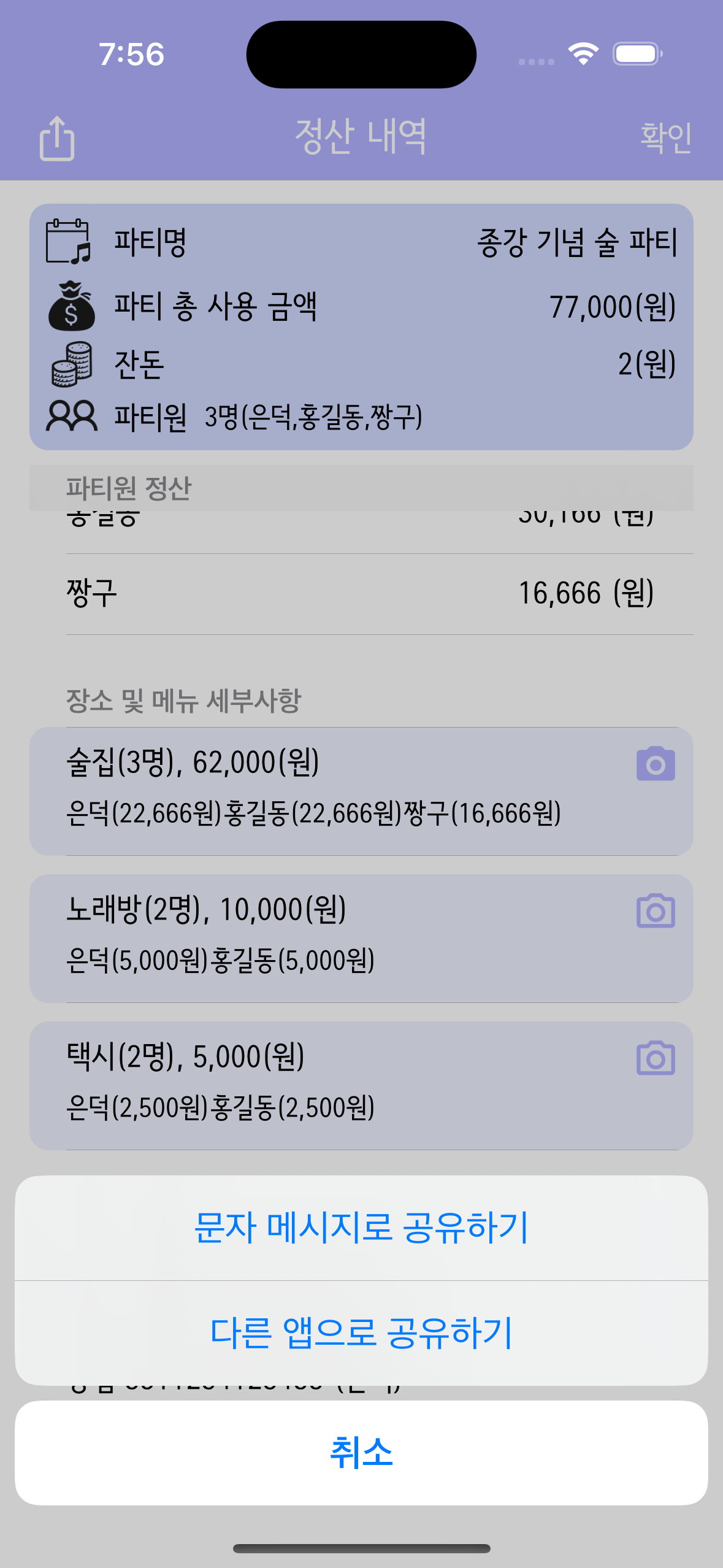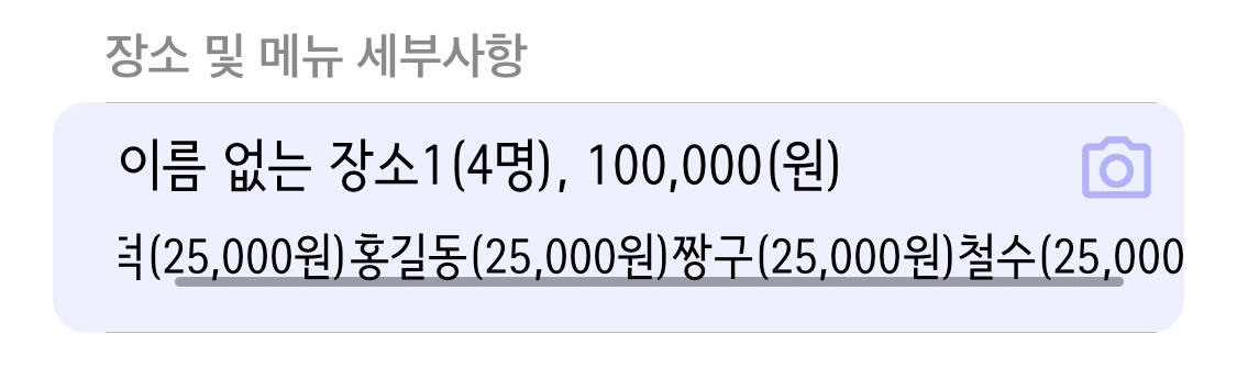 장소 셀을 보면 카메라 아이콘이 있는데 터치하면 전에 등록하였던 영수증 사진을 볼 수 있다. (공유 및 수정도 가능)