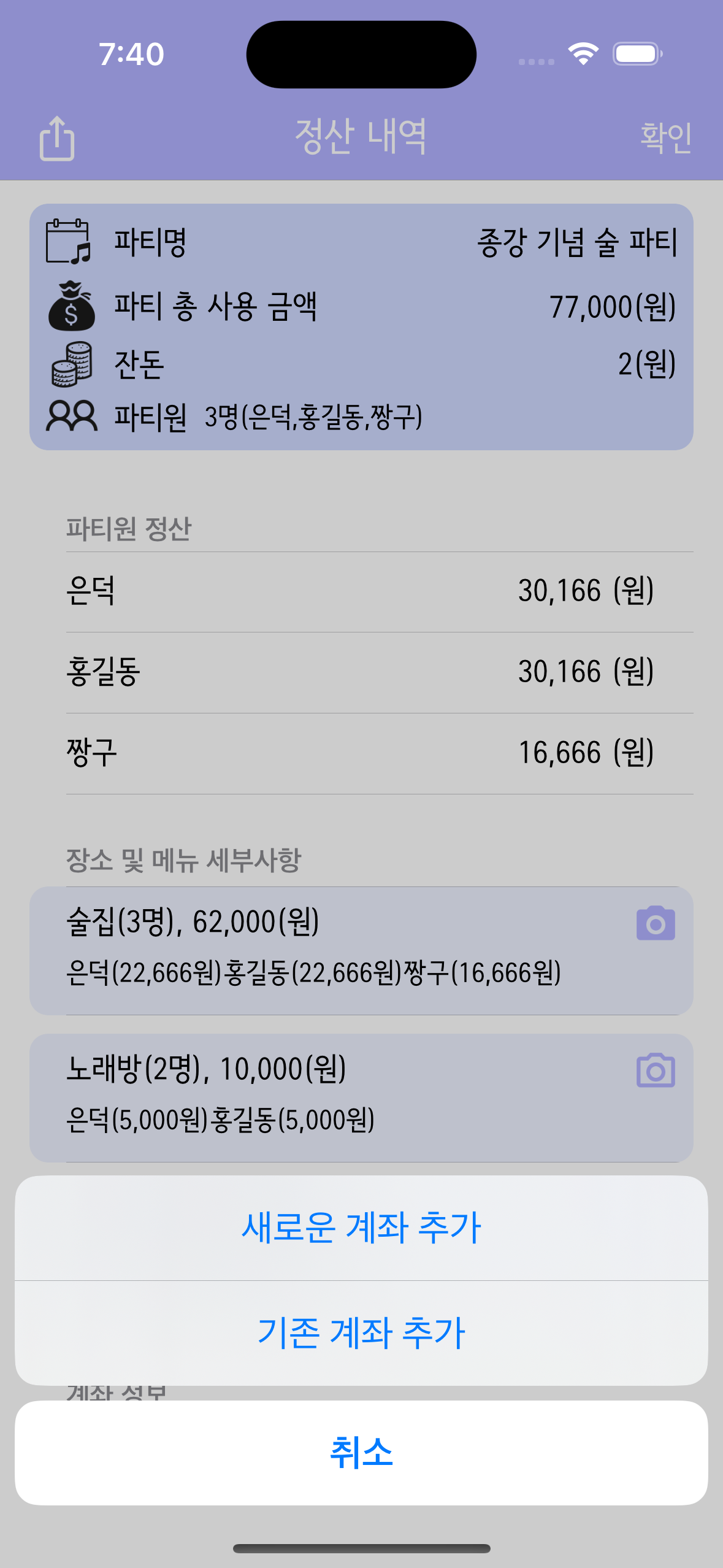 기존 계좌 추가 기능은 어떤 파티방에서든 새로운 계좌를 추가한 적이 있다면 기억해놨다가 위와 같이 피커뷰로 띄워 고를 수 있게 하였다.