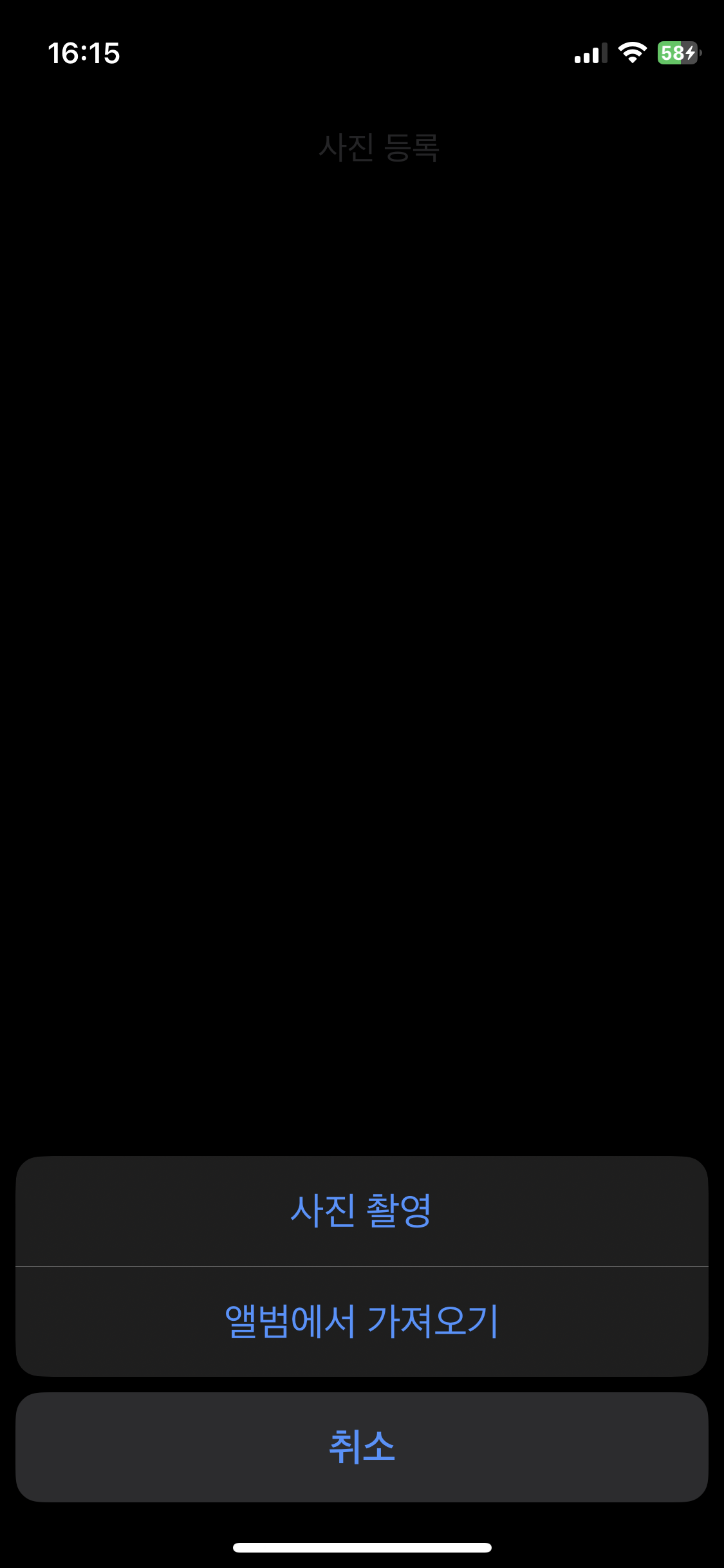 func showActionSheet() { let alertController = UIAlertController(title: nil, message: nil, preferredStyle: .actionSheet) // 사진 촬영 액션 let takePhotoAction = UIAlertAction(title: "사진 촬영", style: .default) { _ in self.openCamera() } // 앨범에서 가져오기 액션 let choosePhotoAction = UIAlertAction(title: "앨범에서 가져오기", style: .default) { _ in self.openPhotoLibrary() } // 취소 액션 let cancelAction = UIAlertAction(title: "취소", style: .cancel, handler: nil) // 액션 추가 alertController.addAction(takePhotoAction) alertController.addAction(choosePhotoAction) alertController.addAction(cancelAction) // 액션 시트 표시 present(alertController, animated: true, completion: nil) }위 코드에 있는 openCamera()와 openPhotoLibrary()함수를 구현해준다.
